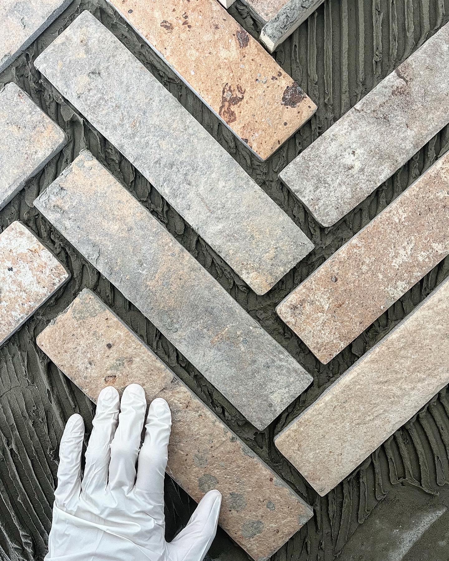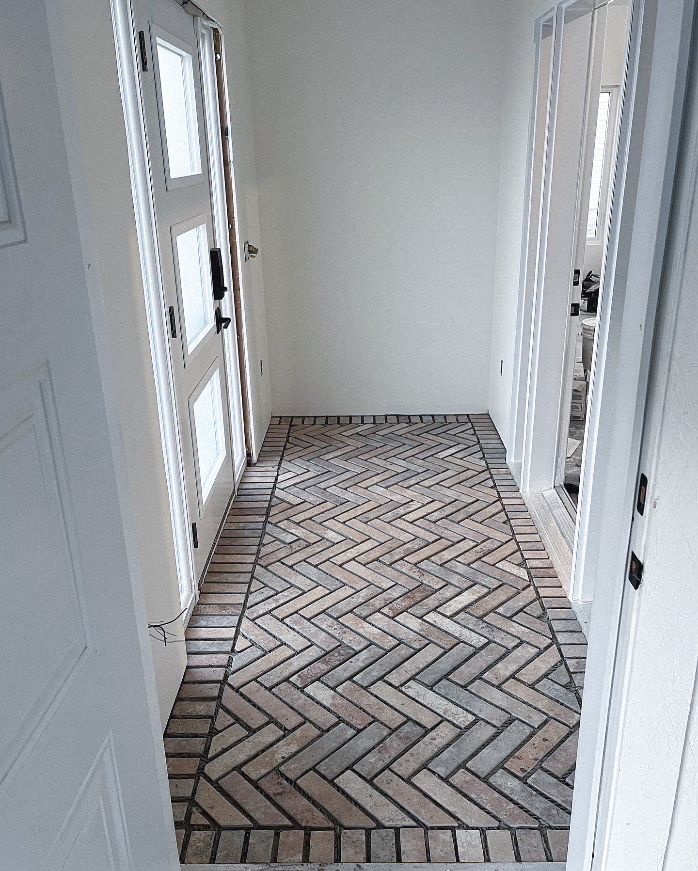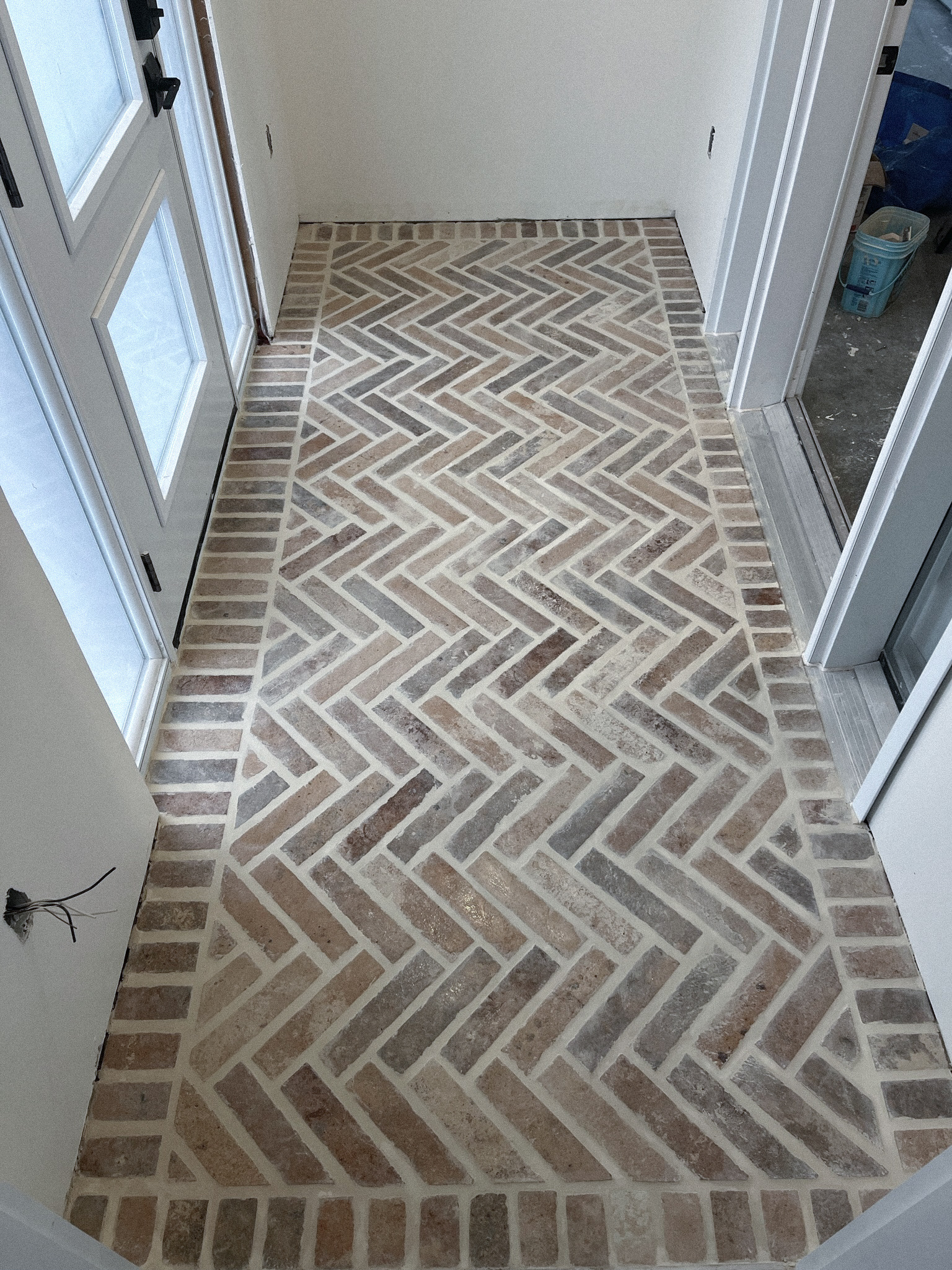 My first experience tiling was in the main floor bathroom. We laid porcelain brick tiles in a herringbone pattern with a boarder. I am very detail oriented and I immediately fell in love with this process. I was later assigned to do the tile in the entryway on my own, as well as the backsplash in the laundry room and the kitchen pantry.