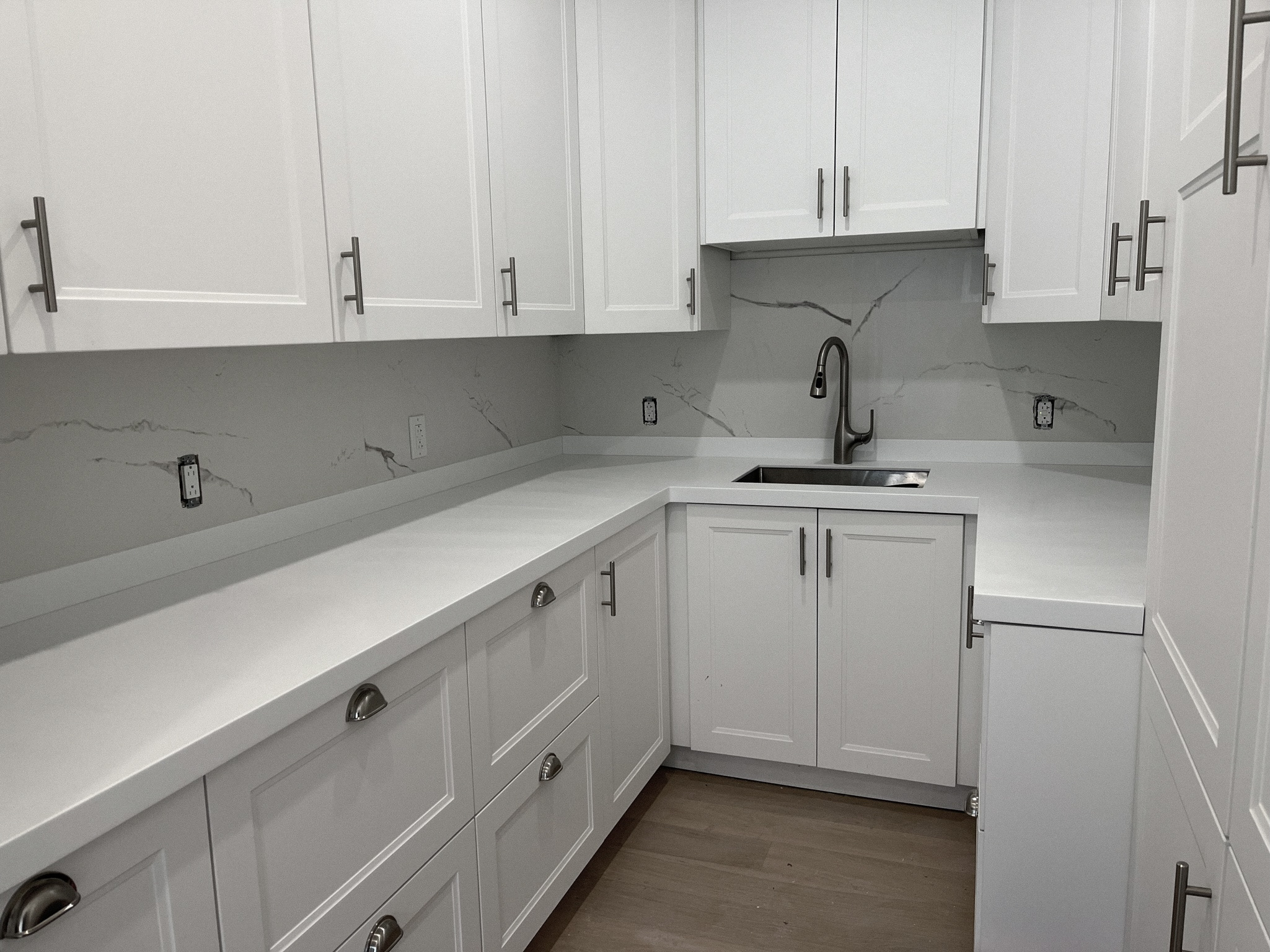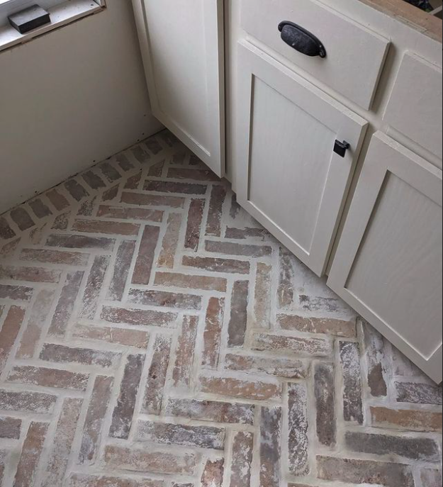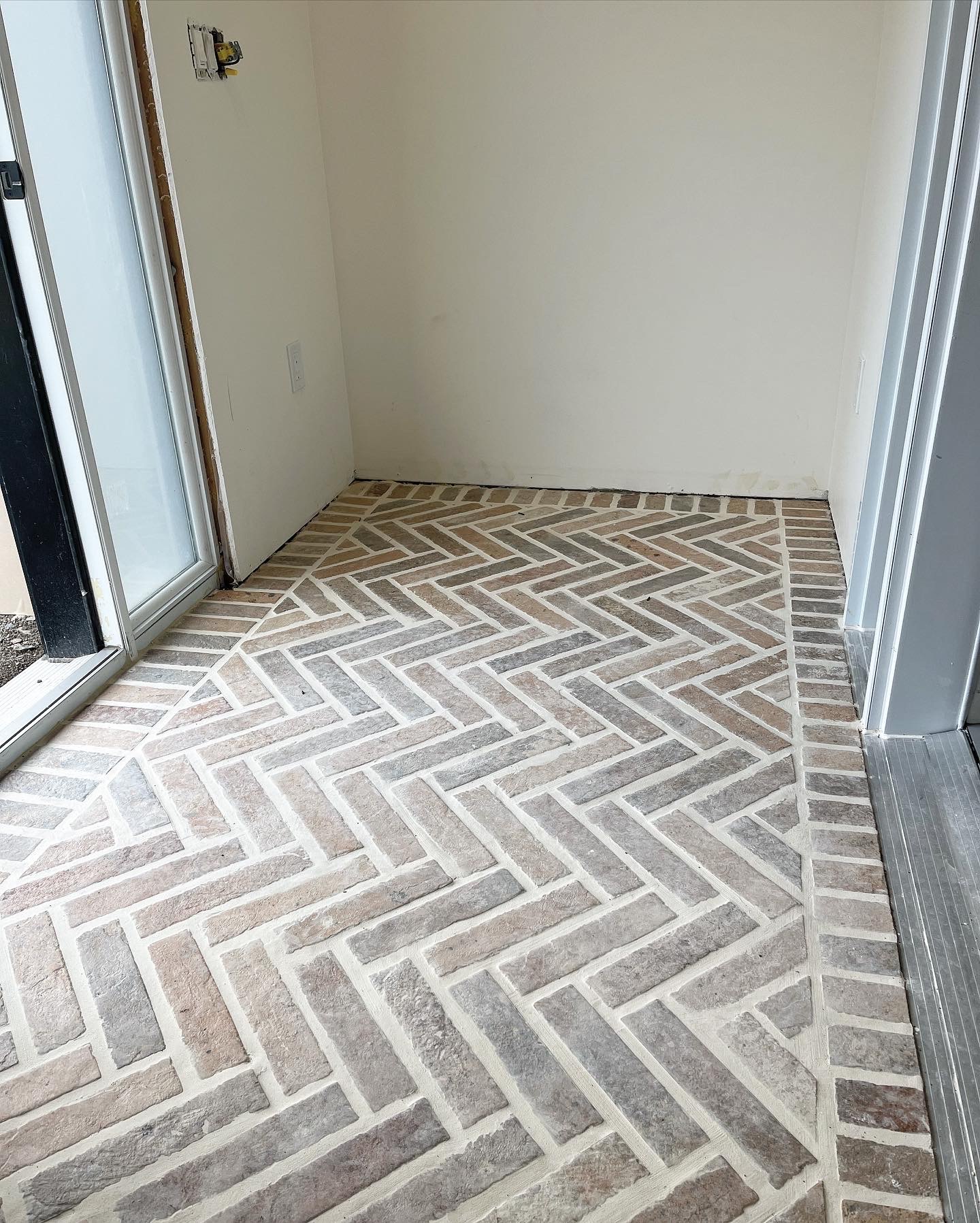 My first experience tiling was in the main floor bathroom. We laid porcelain brick tiles in a herringbone pattern with a boarder. I am very detail oriented and I immediately fell in love with this process. I was later assigned to do the tile in the entryway on my own, as well as the backsplash in the laundry room and the kitchen pantry.
