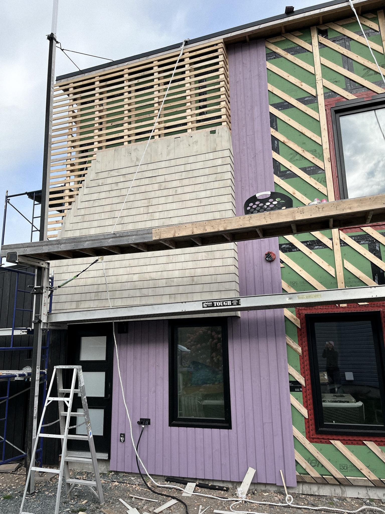 Outside we installed wood siding vertically in purple and black. We built Larsen trusses where the cedar shingles were placed to add dimension to the home.