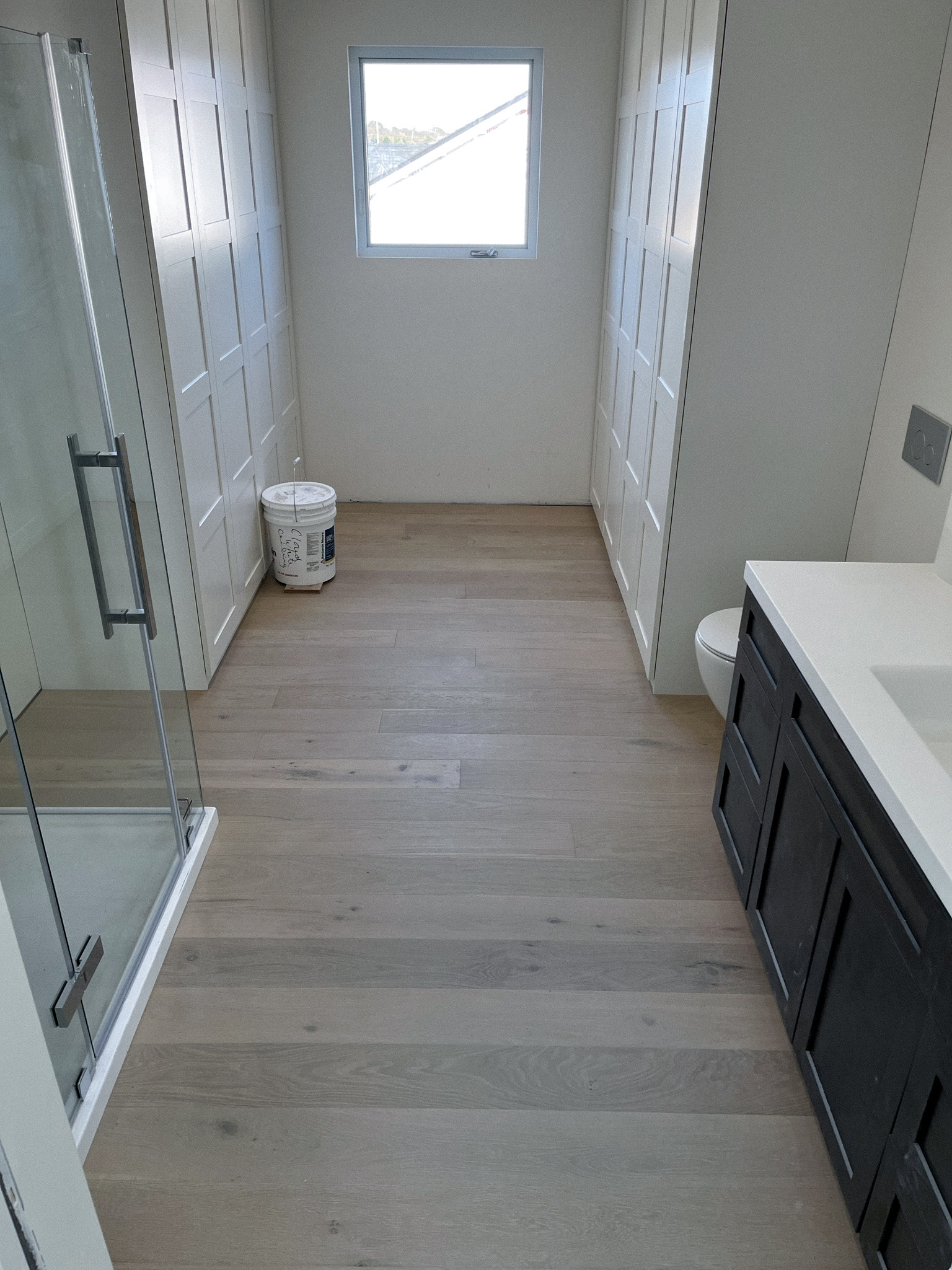When I started at this worksite, the house was bare studs and windows. I was on a team with 3 carpenters and together we installed insulation, pocket doors (in every doorway) and drywall. For the floors, we laid engineered hardwood throughout the majority of the home.